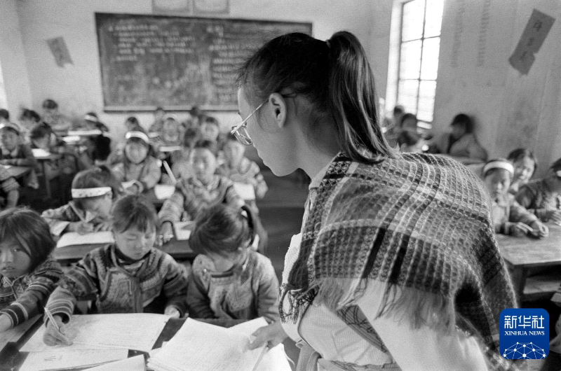 1992年9月,东山乡中心学校女子班老师金华英背着不到半岁的孩子,给学生们上课。