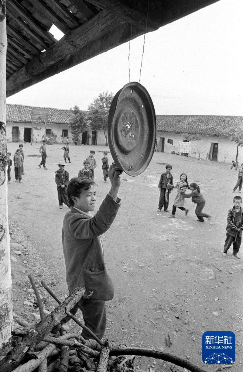 1992年9月,东山乡中心学校的老师敲击汽车轮毂当作上课铃。