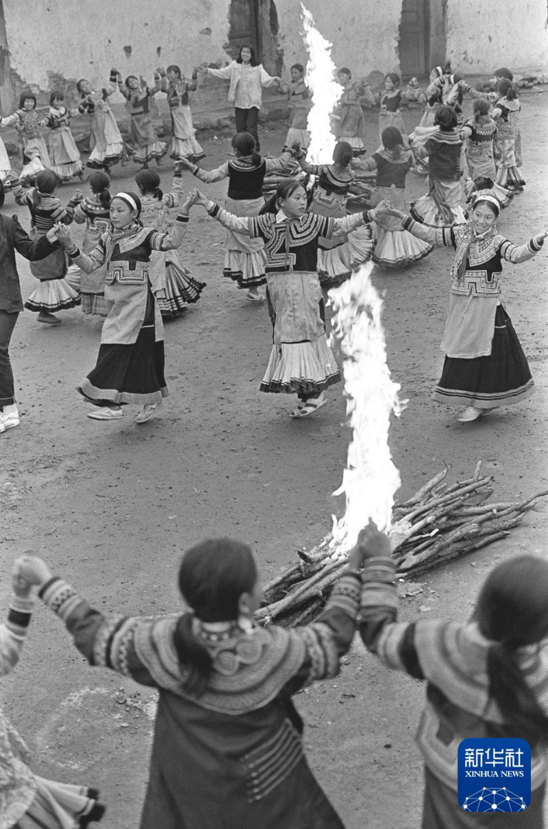 1992年9月,东山乡中心学校女子班的孩子们围着篝火跳舞。