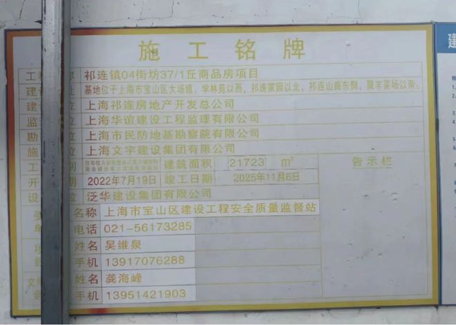 施工铭牌显示,该项目竣工日期为2025年11月,建设单位为上海祁连房地产开发总公司。